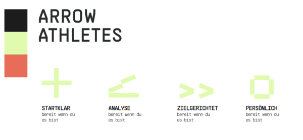 Alex Schnerrow – leidenschaftlicher Rennradfahrer – kennt die Herausforderungen, wenn Leistungssport und Berufsalltag aufeinandertreffen. Um es anderen Athleten_innen leichter zu machen, unterstützt er mit einem seinem Coachingangebot bei der Trainingsplanung und Leistungssteigerung. Markenattribute wie Verbindlichkeit, Präzision und Involvement werden zentrale Richtungsgeber in der Markenentwicklung und der Namensfindung. Aus Alex Schnerrow wird Arrow Athletes. Die Pfeile definieren die Formsprache des minimalistischen Designs und bieten zahlreiche Adaptionsmöglichkeiten für die Kommunikation und die Gestaltung von Sportartikeln.
