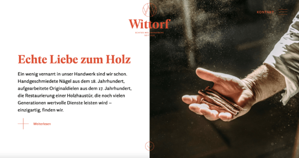 Seit mehr 80 Jahren ist Wittorf ein fester Bestandteil des Hamburger Holzhandwerks. Neue Lebensstile, Bauweisen und wechselnde Generation haben die Schwerpunkte der Zimmerei und Tischlerei über die Jahre geschärft und verändert. Ein Marken- und Kommunikationskonzept legt den Grundstein für das neue Selbstverständnis und die neue Corporate Identity. Eine eigene Bildsprache und die hochwertigen Kommunikationsmittel transportieren die Faszination für das Handwerk, die Fach- und Denkmalsanierung und die Freude an großen Ideen.